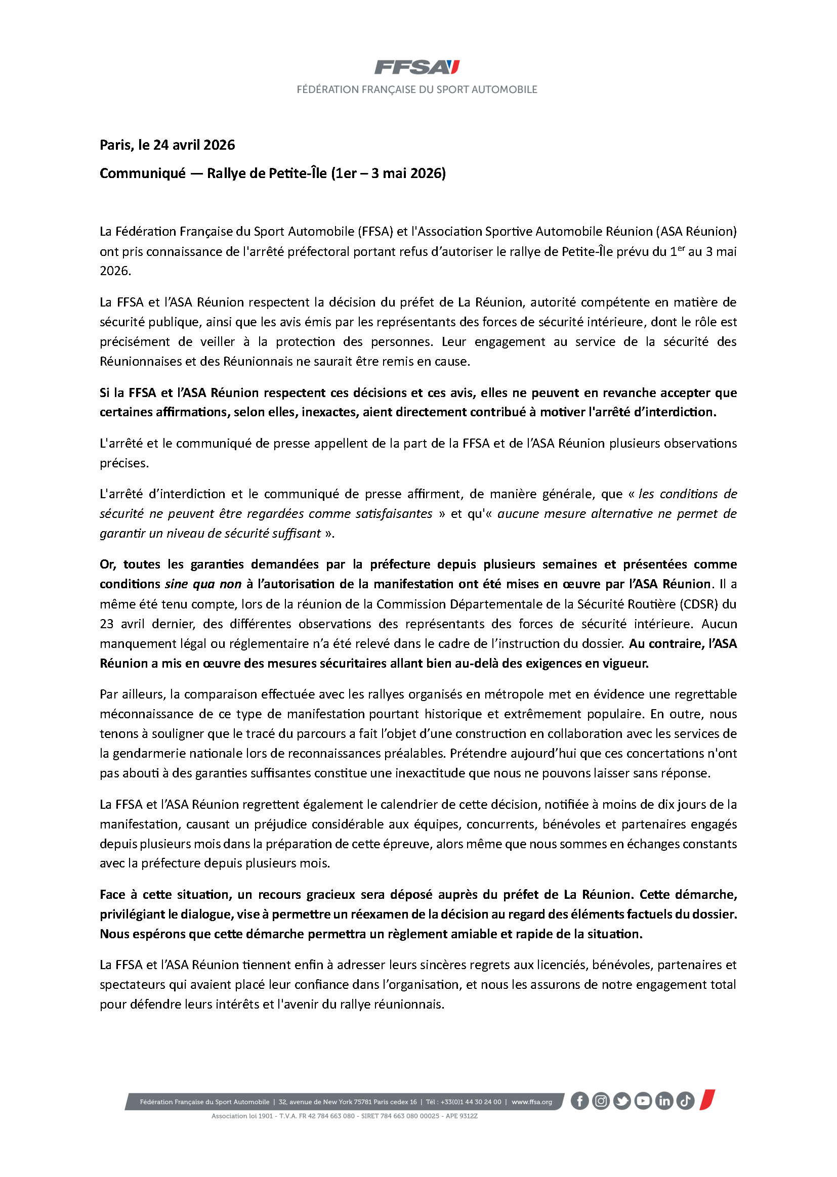 La Fédération Française du Sport Automobile (FFSA) et l’Association Sportive Automobile Réunion (ASA Réunion) ont pris connaissance de l’arrêté préfectoral portant refus d’autoriser le rallye de Petite-Île prévu du 1er au 3 mai 2026.